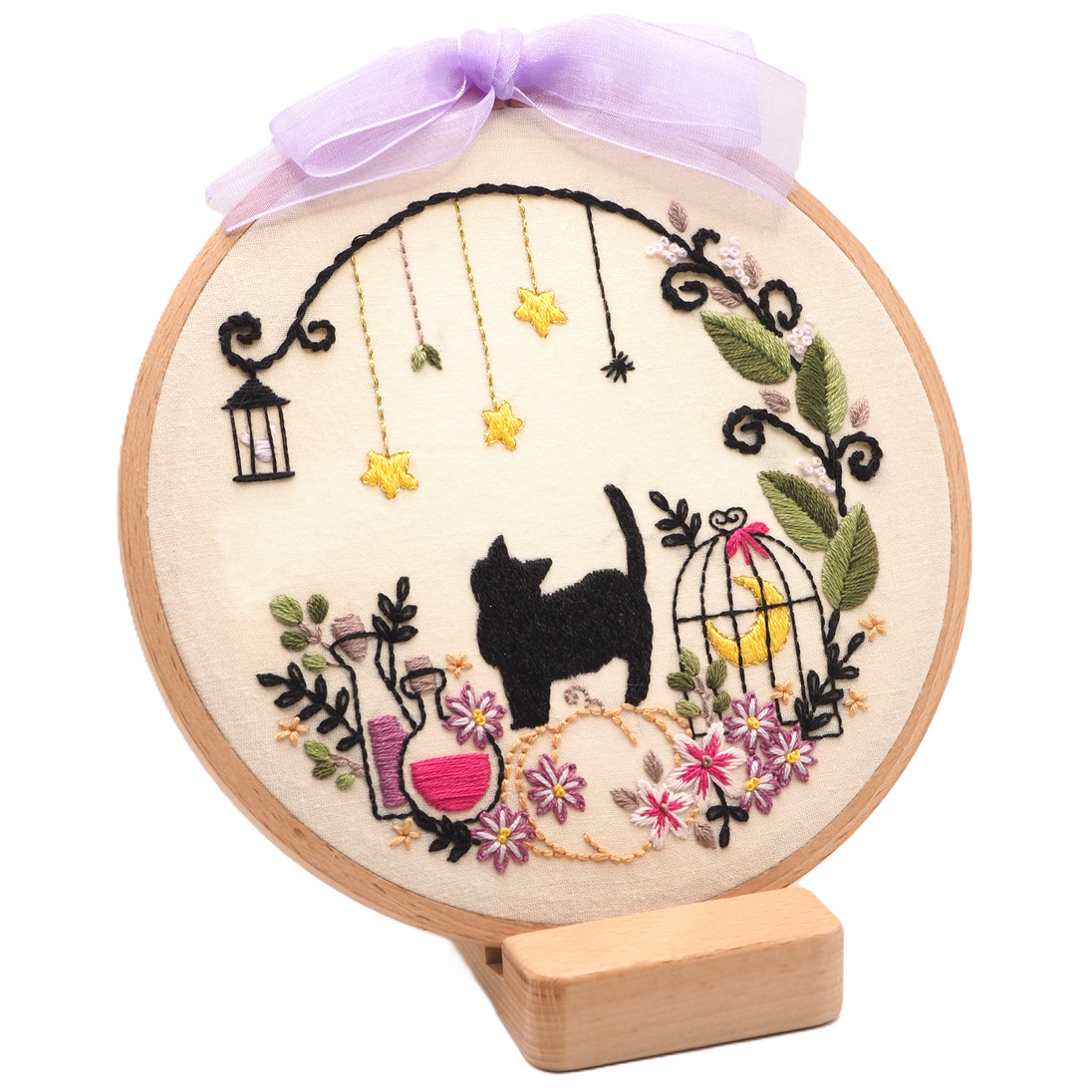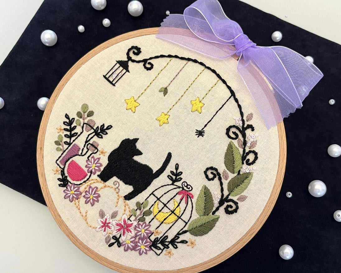 An embroidery kit that is perfect for Halloween or a stary fantasy. This kit is beginner friendly.