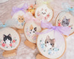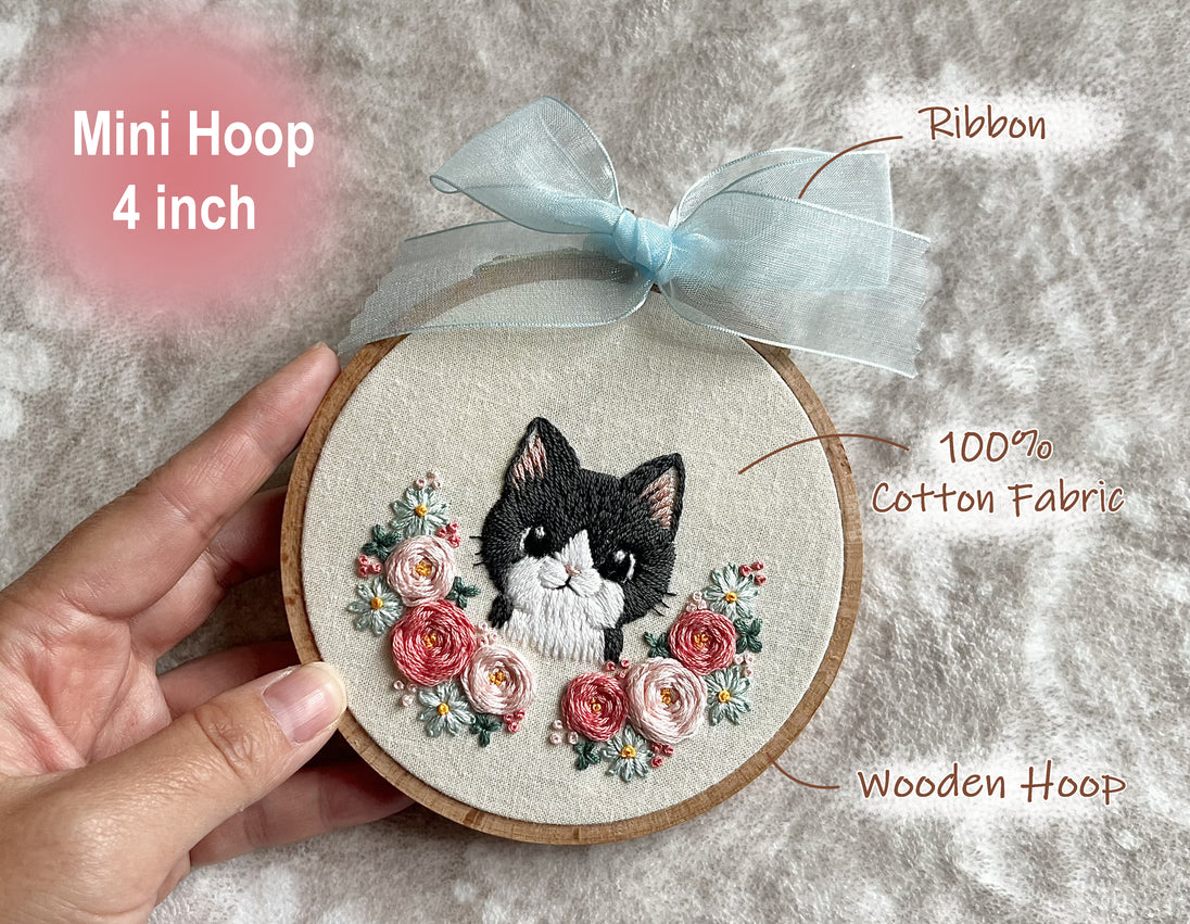 It comes with all materials you need to complete a 'cat portrait embroidery' piece. 6 different cats, with an alternative option, are available, along with 4 different flower themes.