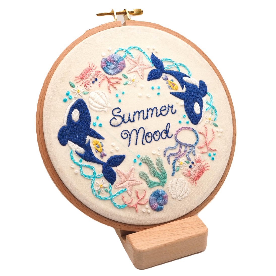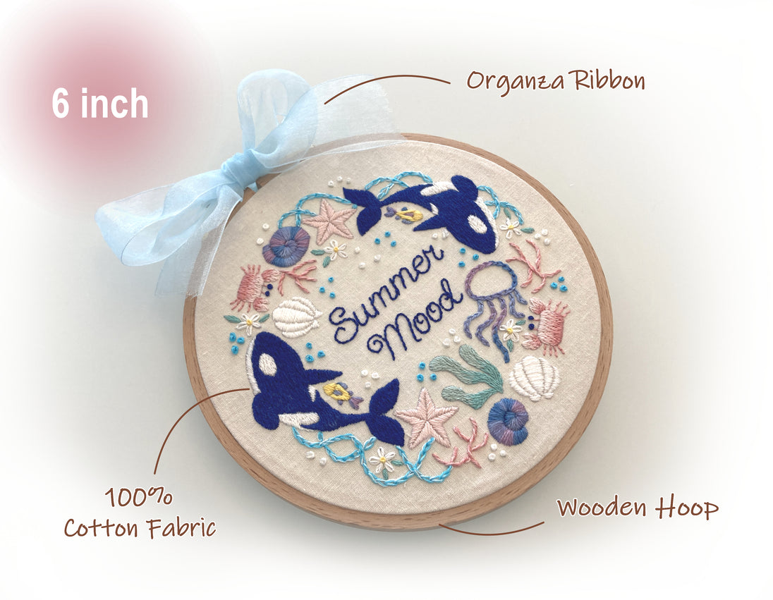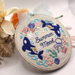 An embroidery kit that is perfect for summer and orca lovers. This kit is beginner friendly.