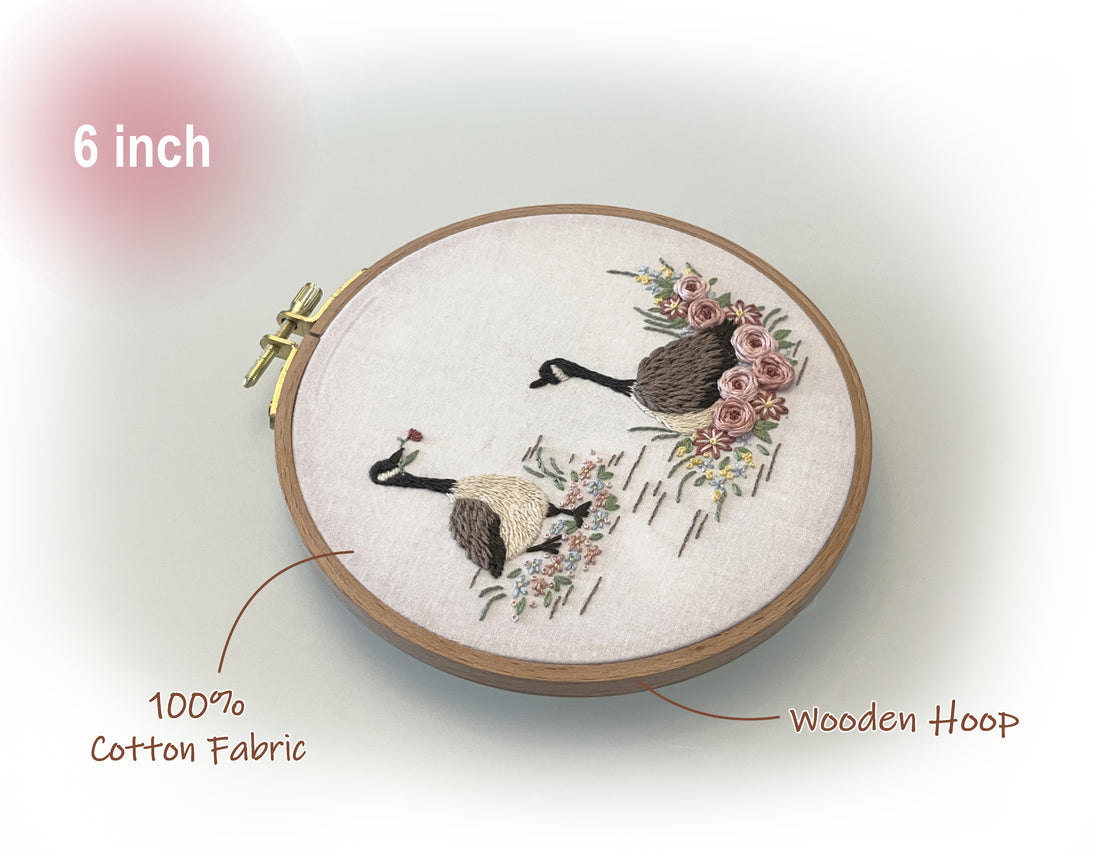 This Goose Couple embroidery pattern is designed for a 6" hoop.