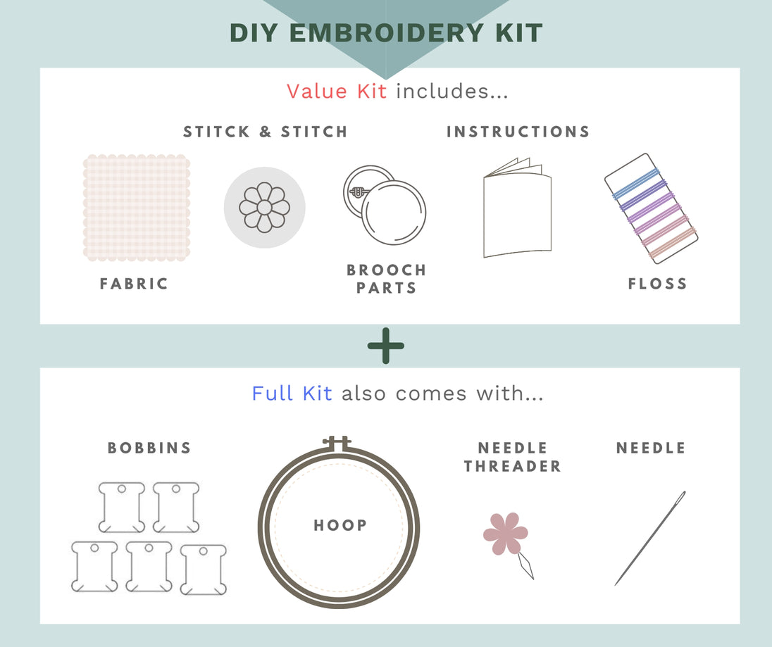 A value kit includes only instructions and materials such as fabric, floss and brooch parts. A full kit includes everything in a value kit PLUS tools such as a hoop, needle, needle threader and bobbins that you will need to start and complete a kit. For more information, please read 'What is included' section.