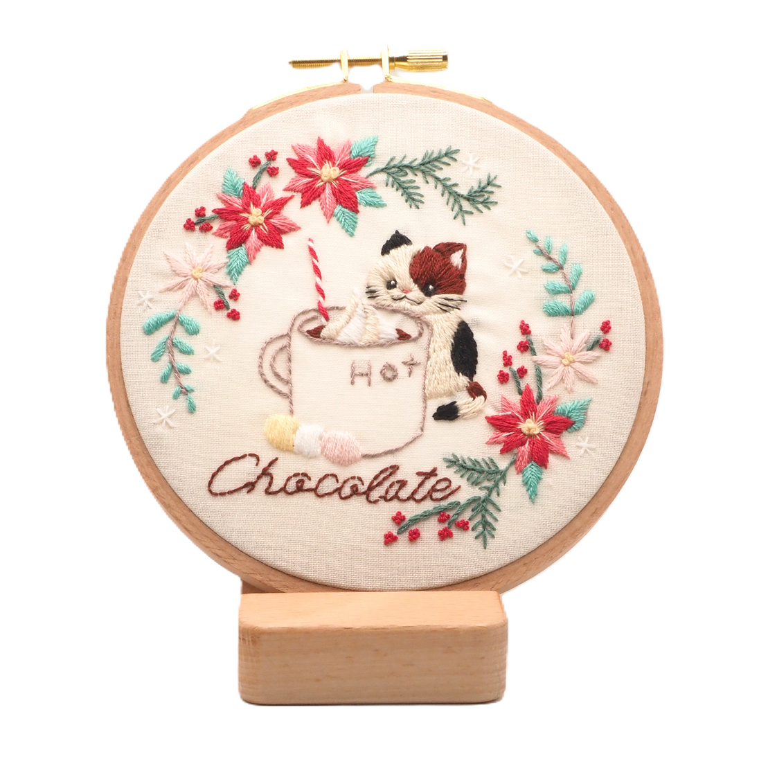 A cute calico cat eyeing the delicious cream on the hot chocolate drink. This embroidery kit and the series are perfect for hot drinks and cat lovers! This is an intermediate level kit.