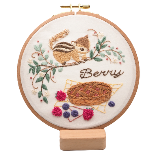 DIY Embroidery Kit 'Berry Pie'.A cute chipmunk is getting ready to eat a delicious berry pie. This embroidery kit is perfect for holidays as pies are a great staple! This is an intermediate level kit.Blueberries, raspberries...Regular price From $29.00Quick view