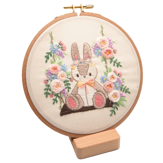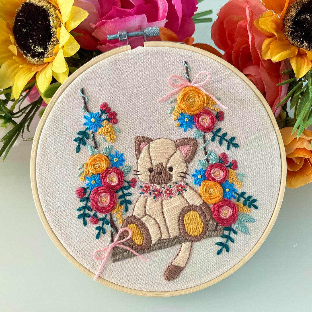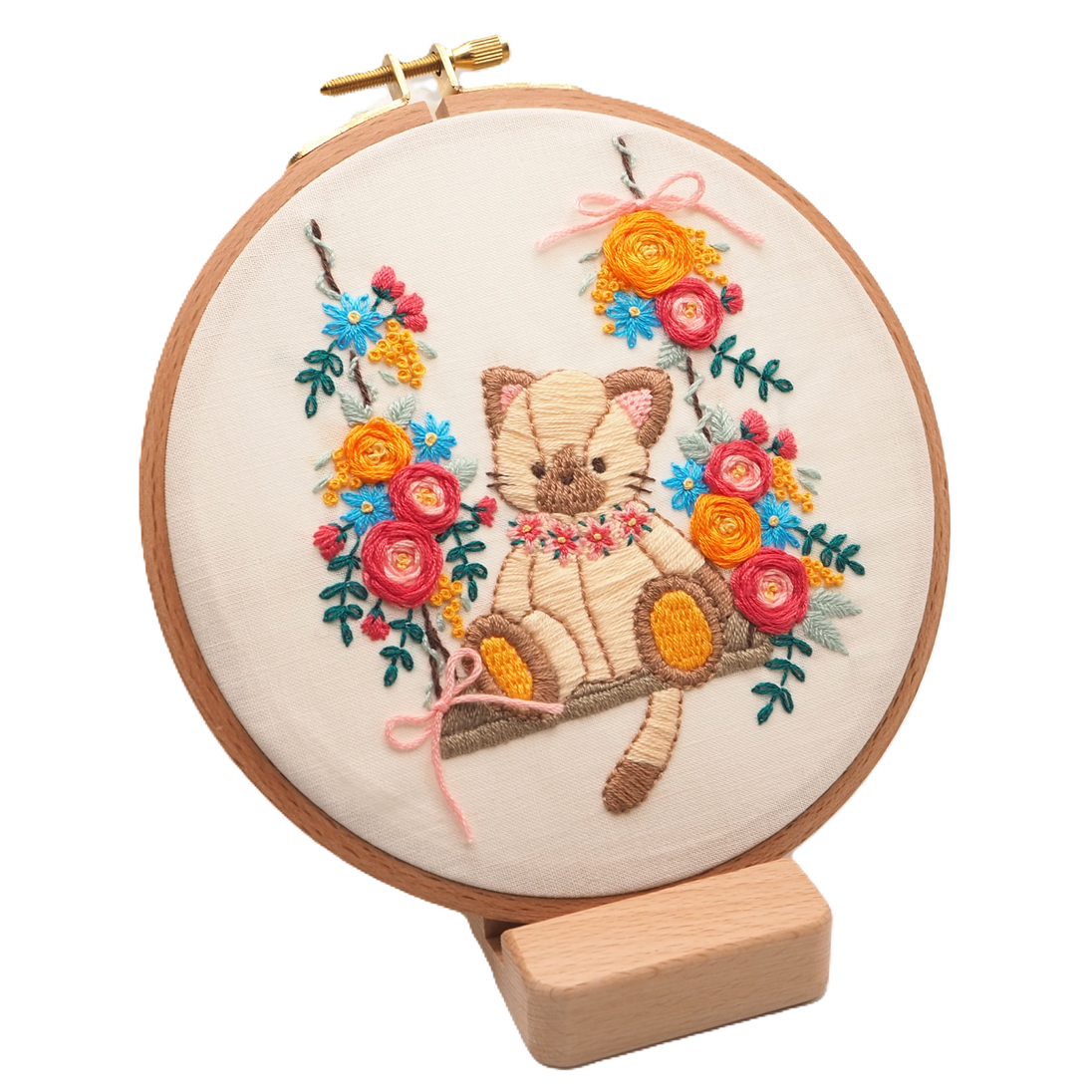 Un adorable petit chat en peluche posé sur une balançoire fleurie. Ce kit est adapté aux débutants supérieurs.