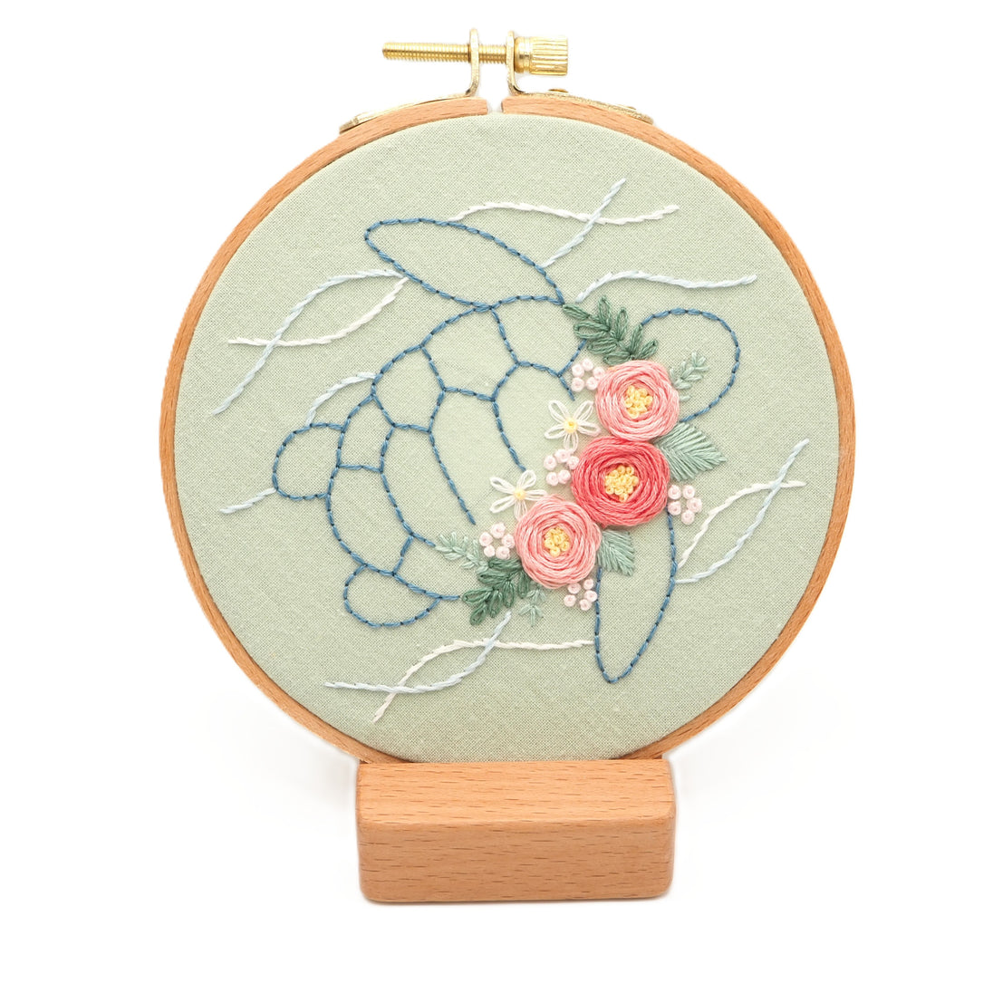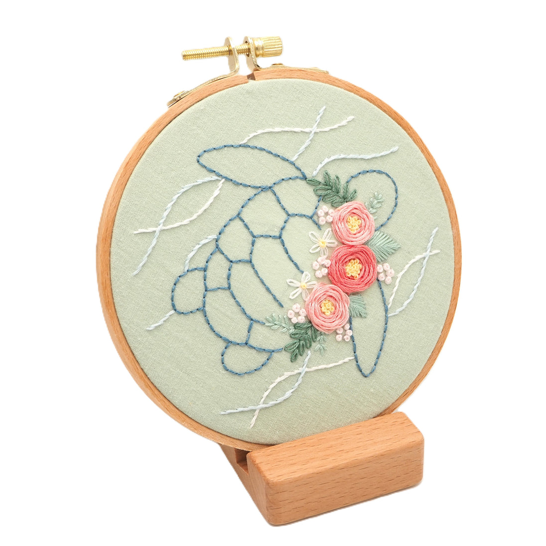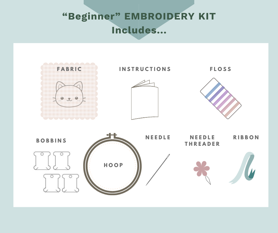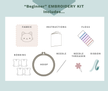 The fabric color "Green Tea" is made from natural cotton. The embroidery pattern is designed for a 5" hoop. This "Full Kit" includes materials and tools listed below.